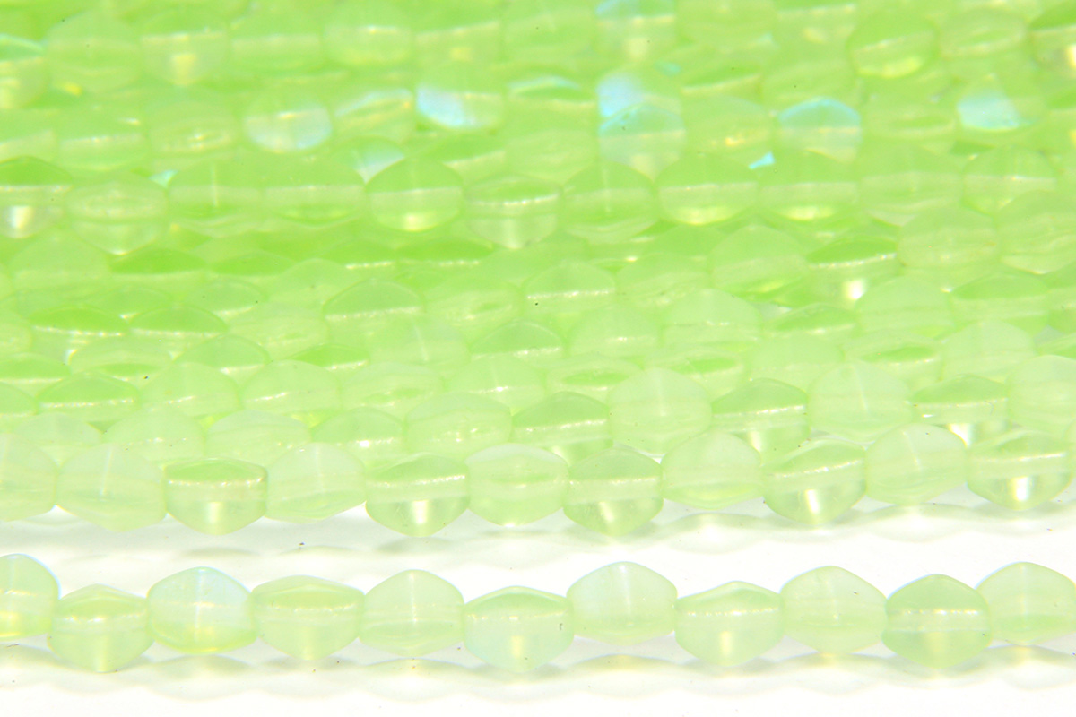 A 38 bead strand of high quality Czech pressed glass Lemon Green Lustre Pinch Beads. With 3 flat surfaces to catch the light that are tapered at each end to give a barrel like appearance, these beautiful beads are perfect G8 adding some interesting texture to your designs in an understated way. Lustred transparent glass
